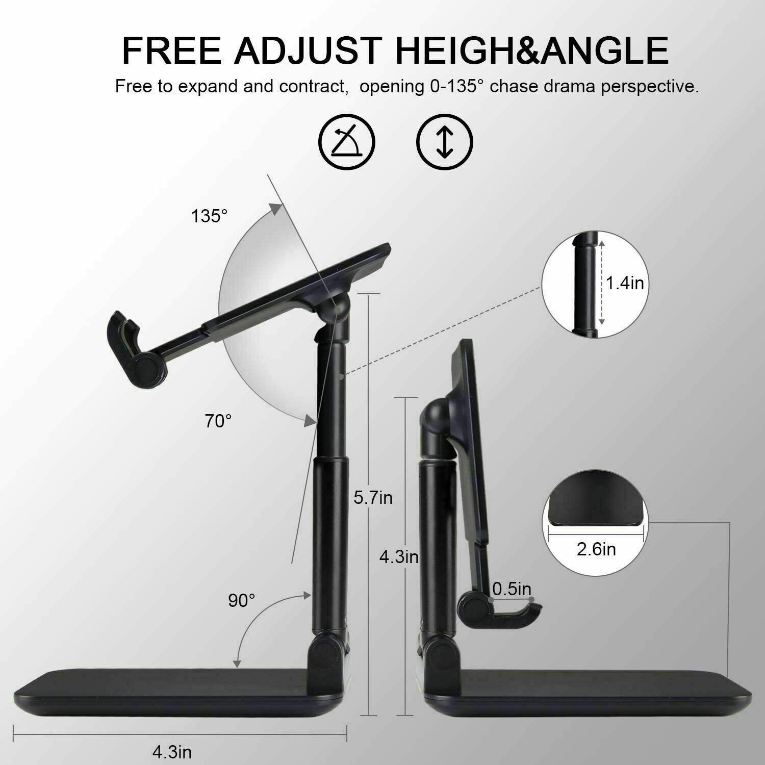ANGLE & HEIGHT ADJUSTABLE 】The desktop phone holder stand can be adjusted from 4.3” to 6.3”,easily extendable in height. Also, it allows you to customize the angle of your device flexibly to find the most comfortable viewing angle. Reduce the frequency of looking down at the phone screen to avoid hurting your back and neck.